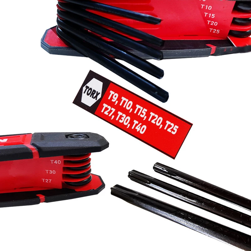 فولاد و آلیاژ مورد استفاده در ساخت این آچارها دارای مقاومت بسیار بالا در برابر فشار، حرارت، حرکات پیچشی و ضربه میباشند. آچارهای آلن موجود در این مجموعه برای مهرهها و پیچهای سایز T-9 T-10 T-15 T-20 T-25 T-27 T-30 T-40 مناسب هستند.