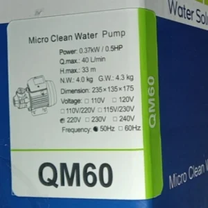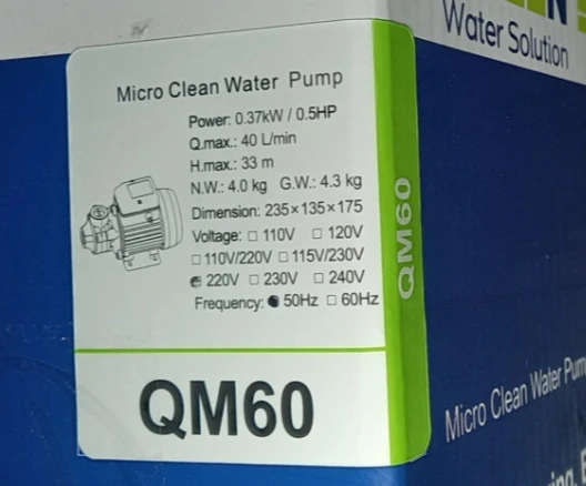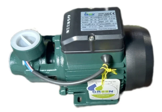 پمپ گرین GREEN QM60 با توان 0.37 کیلووات یا نیم اسب بخار می تواند آب و سیالاتی که خواص فیزیکی و شیمیایی مشابه آن را پمپاژ کند. توانایی ایجاد دبی تا 2/4 متر مکعب بر ساعت و ارتفاع (هد) تا 33 متر ( فشار 3.3) بار را دارد. قطر لوله ورودی و خروجی یک اینچ است بدنه این محصول از جنس چدن ضد زنگ و پروانه آن برنجی و محور اصلی از جنس استیل است این پمپ دارای یکسال گارانتی تعویض می باشد.