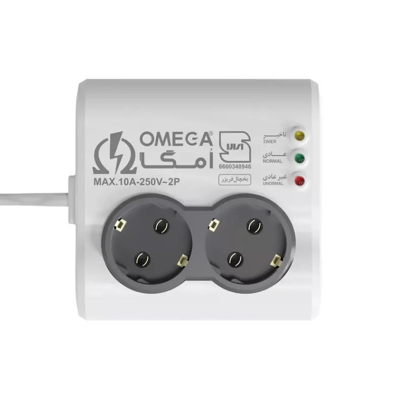 محافظ برق 2 خانه امگا مدل P4000، برای محافظت از یخچال و فریزر در منزل و محل کار مناسب می باشد. این محافظ با کابلی به طول 2 متر، امکان اتصال 2 عدد از یخچال و فریزر را فراهم می کند تا بدون دردسر از این دستگاه ها به طور همزمان و در کنار هم استفاده نمایید. در ساخت این محصول، مواد مرغوب و پلاستیک سخت با کیفیت به کار رفته که مقاومت بالایی در برابر ضربه و فشار از خود نشان می دهد و همچنین جنس روکش کابل آن نیز از استحکام خوبی در برابر جابجایی و کشیدگی برخوردار است. حداقل ولتاژ برای قطع جریان برق در این دستگاه ۱۷۰-۱۸۰ ولت و حداکثر ولتاژ برای قطع شدن جریان ۲۴۰-۲۴۵ ولت می باشد. حداکثر توان قابل پشتیبانی این محافظ برابر با ۲۵۰۰ وات و حداکثر جریان خروجی آن ۱۰ آمپر بوده و زمان تاخیر برای یخجال و فریزر حدود ۴ تا ۶ دقیقه است. بر روی بدنه این محافظ، ۳ نشانگر LED تعبیه شده که وضعیت کارکرد عادی، تاخیر و غیر عادی جریان برق مناسب برای دستگاه های متصل را نشان می دهند.