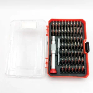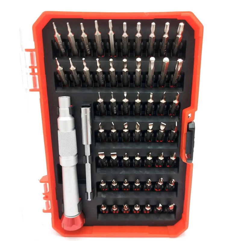 شامل: 2عدد بیت دوسو با سایز 1 میلی متر و 3 عدد بیت دوسو با سایز 1.5 میلی متر و 3 عدد بیت دوسو با سایز 2 میلی متر و 2 عدد بیت دوسو با سایز 2.5 میلی متر و 2 عدد بیت دوسو با سایز 3 میلی متر و 2 عدد بیت دوسو با سایز 3.5 میلی متر و 2 عدد بیت دوسو باسایز 4 میلی متر و 3عدد بیت چهارسو با سایز PH000 و 3 عدد بیت چهارسو با سایز PH00 و 3 عدد بیت چهارسو با سایز PH0 و 3 عدد بیت چهارسو با سایز PH1 و 1عدد بیت T2 و 1 عدد بیت T3 و 1 عدد بیت T4 و 1 عدد بیت T5 و 1 عدد بیت T6 و 1 عدد بیت T7 و 1 عدد بیت T8 و 1 عدد بیت T9 و 1 عدد بیت T10 و یک عدد بیت T15 و 1 عدد بیت T20 و همچین بیت های آلن با سایز های 0.7 و 0.9 1.3 و 1.5 و 2 و 2.5 و 3 و 3.5 و 4 و 1 عدد بیت مثلثی با سیز 2.3 و 1 عدد بیت U2.6 و 2 عدد بیت ستاره با ستایز های 0.8 و 1.2 و 3 عدد سری Y با سایز های Y00 و Y0 و Y1 می باشد.