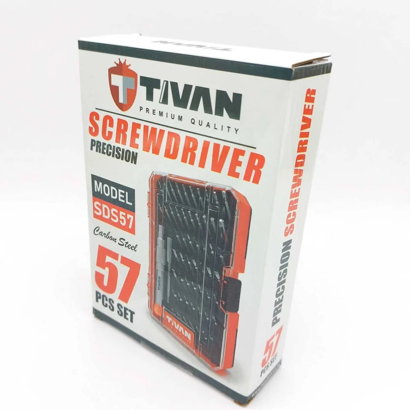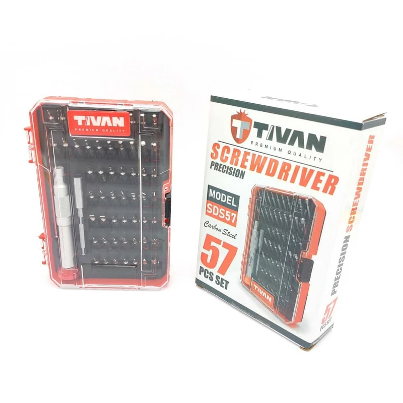 مجموعه 57 عددی پیچ گوشتی ساعتی تیوان که شامل یک دسته از جنس آلومینیوم به طول 108 میلی متر و یک واسطه به طول 75 میلی متر و 55 بیت به طول 28 میلی متر